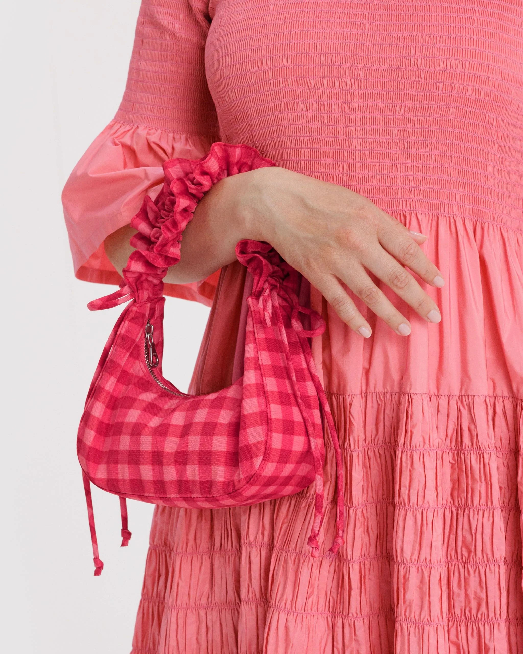 A new take on our popular crescent shape, featuring fashion designer Molly Goddard’s signature gathered ruffles. The ruffled drawstring strap adjusts for hand carry or shoulder wear. Inside, a zip pocket and key leash keep essentials secure. Fits your phone, wallet, Baby Baggu, and small extras.